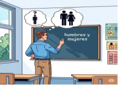 En un aula escolar con pupitres, un docente está de espaldas, escribiendo en el pizarrón la frase «hombres y mujeres». Sobre su cabeza aparece un globo de pensamiento donde se ve un símbolo de persona con un signo de pregunta; y otro globo con los símbolos binarios de hombre y mujer.