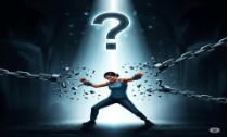 En el centro de la imagen una mujer rompe dos cadenas con los brazos extendidos, mientras un gran signo de pregunta iluminado por un rayo de luz aparece sobre su cabeza. El fondo es oscuro y la luz cae desde arriba.