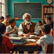 En la última imagen se visualiza un docente sentado en una mesa rodeada por estudiantes pequeños. La escena muestra un momento de enseñanza en el aula, con materiales escolares y una pizarra al fondo, evocando un entorno de aprendizaje cotidiano. Aquí mismo, se pueden visualizar muchos sesgos ideológicos: no necesariamente Freire (1970) desarrollaba clases en el marco de una educación formal, tampoco escribiendo en idioma inglés.