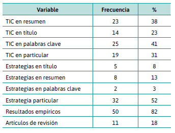 En la primera parte de los resultados describimos un análisis preliminar de los datos en función de las variables construidas (véase Tabla 1). tic fue mencionado con mayor frecuencia en palabras clave (n=25, 41 %), seguido en resumen (n=23, 38 %) y más escasamente en título (n=14, 23 %).