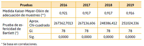 La medida kmo indica un valor superior a 0,9 en todos los años, por lo que es correcto y apropiado realizar los cálculos factoriales, a la vez que la prueba de esfericidad de Bartlett confirma que las variables se encuentran un grado de intercorrelación muy alto.