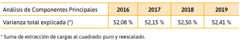 En el tercer paso, continuamos con el análisis de la estructura de correlaciones. Aquí interesa determinar la varianza y co-varianza entre lasvariables, sea un vector de variables aleatorias. La siguiente tabla muestra la varianza total explicada extraída por el método de componentes principales de la primera componente: