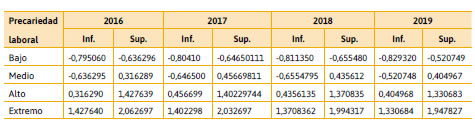 Es importante destacar las limitaciones de este estudio. Se realizaron procedimientos metodológicos para sintetizar múltiples variables relacionadas con la precariedad laboral (análisis de componentes principales –acp–), y posteriormente se construyó un índice definiendo como bajo, medio, alto y extremo los niveles de precariedad; en ambos casos se sintetiza y reduce la información y la complejidad del fenómeno de la precariedad.