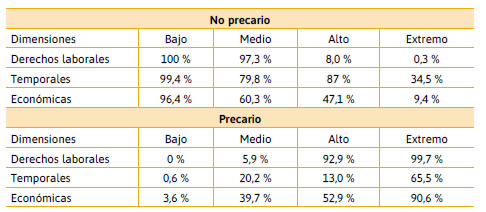 Precario bajo: empleos que cumplen con todos los derechos laborales (100 %), en su dimensión temporal pueden expresar trabajos con turnos rotativos o nocturnos (0,3 %) y en su dimensión económica manifiestan la presencia de casos con más de una ocupación (3,6 %).