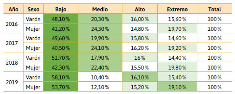 Sobre la variable sexo podemos destacar que las mayores concentraciones a lo largo de todos los años se ubican en el nivel bajo, superando en proporción los varones a las mujeres. Los resultados más elevados en el nivel bajo se exhiben en 2019, donde varones y mujeres alcanzan la mayor concentración de casos (58,1 % y 53,5 %, respectivamente). En relación con el nivel de precariedad medio, en todos los años tienden para ambos casos a disminuir su distribución porcentual, siendo mayor la concentración de mujeres en este nivel que de varones. Sin embargo, la participación de varones por año en el nivel medio de precariedad disminuye con mayor amplitud.