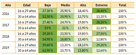 Por otro lado, el grupo de 30 a 64 años fortalece su participación en el nivel bajo exhibiendo mayores frecuencias de casos por cada año, ubicándose con el 52,3 % en 2016 y finalizando 2019 con el 62,9 %, al tiempo que aumenta su participación entre 2016 y 2017 en el nivel precario medio (20,9 % al 21 %, respectivamente) y luego desciende al 18,8 % y 10,7 % en 2018 y 2019.