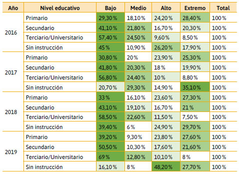El nivel primario presenta mayor proporción relativa en el nivel bajo, frecuencia que va en aumento desde 2016 a 2019; al tiempo que disminuye su concentración en el nivel de precariedad medio, con excepción del año 2017, donde repunta respecto del año 2016 (18,1 % a 20 %, respectivamente). Sin embargo, encontramos mayor frecuencia de casos en los niveles precario alto y extremo. En el primero, con valores entre 24,2 % y23, 6 % y en el segundo entre 28,4 % y 27, 3 %. A lo largo de los años en estos niveles las frecuencias relativas observadas tienden a disminuir en el nivel precario alto y a sostenerse en el precario extremo al menos sobre los dos últimos años de la serie 2018 y 2019.