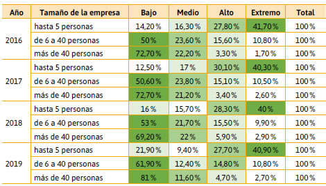 Entre los establecimientos de más de 40 personas las mayores distribuciones porcentuales por año se encuentran en el nivel bajo, superando relativamente además al resto de los indicadores, logrando en el 2019 su máximo con el 81 %. La participación de este indicador en el nivel precario medio es del 22,2 % en el 2016 y desciende en el 2017 con el 21,2 %, se incrementa en el 2018 con el 22 % y reduce su participación al 11,6 % en el 2019.