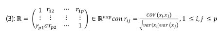 También puede calcularse la matriz muestral de correlaciones R partiendo de X. Brindan información sobre la «concomitancia en la variabilidad observada en las variables cuando son tomadas de a pares. Las variables que muestran baja correlación serán candidatas a ser eliminadas del análisis» (Schuschny y Soto, 2009: 43).