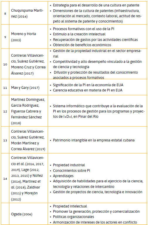 Martínez Domínguez, García Rodríguez, Figueroa Cabrera y Fernández Sánchez (2018) propusieron un sistema informático que contribuye a la evaluación de la PI en los procesos de gestión para los programas y proyectos de I+D+i, en Pinar del Río. No obstante, Contreras Villavicencio et al. (2019) realizaron un estudio orientado a fortalecer el patrimonio intangible en la empresa estatal cubana; ponen de manifiesto el desconocimiento de esta rama jurídica en el sector empresarial cubano, aunque aseveran cuestiones de interés respecto a los beneficios económicos y sociales que generan los derechos de PI.