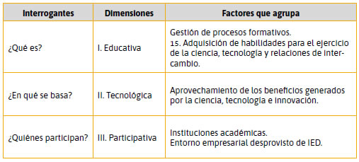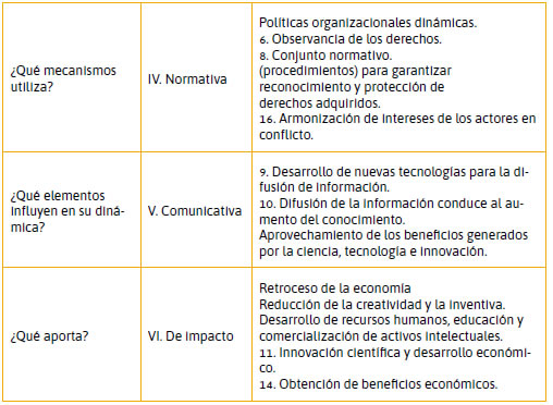 En la Tabla 2 se expone cómo el concepto de cultura en propiedad industrial debe responder a interrogantes básicos que definan su esencia. Estos interrogantes a su vez permiten segmentar el concepto en seis dimensiones: educativa, tecnológica, participativa, normativa, comunicativa, de impacto. Estas dimensiones pueden ser definidas de la siguiente manera: