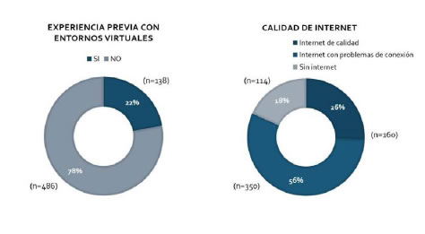 Por último, más de la mitad de respondentes (54%, n=337) indicó no tener un espacio para llevar a cabo las actividades virtuales con tranquilidad, mientras que un 33,3% (n=208) sí disponía un espacio tranquilo y un 12,7% (n=79) solo ocasionalmente.