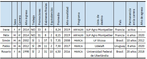 En el cuadro siguiente sistematizamos información acerca de la trayectoria en la carrera y en movilidad académica de las/os cinco entrevistadas/os.