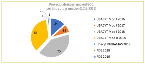 Para el período en análisis (2016-2019), la Universidad de Buenos Aires financió y acreditó un total de 1.505 proyectos distribuidos entre las distintas dependencias, si se consideran las convocatorias ubacyt, ubacyt piuba (Programas Interdisciplinarios de la uba) y ubacyt pde (Proyectos de Desarrollo Estratégico). El 12 % de dichos proyectos (181) corresponden a la Facultad de Ciencias Sociales, unidad académica en la que se hace foco.