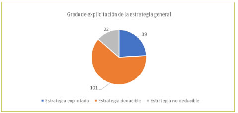 A la hora de identificar la estrategia metodológica general planteada por cada proyecto, se llevó adelante una lectura atenta de los resúmenes para su clasificación. Como primera cuestión, se observó que la mayoría de estos no enuncian de forma explícita de qué manera se proponen trabajar para dar respuesta a sus interrogantes de investigación. Más específicamente, solo 39 resúmenes de los 162 (24,1 %) indican si utilizan una estrategia general cualitativa, cuantitativa o mixta. De estos 39 resúmenes, veintidós plantean una investigación cualitativa, quince mixta y dos cuantitativa. Ahora bien, en los restantes se puede distinguir entre los que no contienen información suficiente que permita deducir esta clasificación (veintidós sobre el total: 13,6 %) y aquellos que expresan una posición intermedia, es decir, la estrategia metodológica no se encuentra explicitada, pero aportan una serie de elementos que permiten interpretar su forma de trabajo y así clasificarlos (101 sobre el total: 62,3 %), según se aprecia en el Gráfico 3.