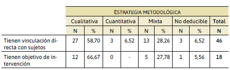 En los apartados anteriores se describieron los hallazgos del análisis de frecuencias relativas y absolutas que se realizaron en torno a las categorías: «estrategia metodológica general», «vinculación directa con sujetos para la producción de datos empíricos» y «presencia de un objetivo de intervención sobre la realidad». En esta sección se presentan los hallazgos encontrados en la estratificación realizada entre variables: por un lado, la vinculación directa con sujetos y la presencia de un objetivo de intervención fueron estratificadas por estrategia metodológica; y por el otro, la presencia de un objetivo de intervención se estratificó por vinculación directa con sujetos. En la Tabla 1 se muestran los datos de la estratificación realizada.