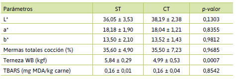 La carne no presentó diferencias significativas (p < 0,05) en el pH para los tratamientos st y ct, con valores promedio de 5,50 ± 0,15, estando dentro del rango normal para esta especie y categoría.