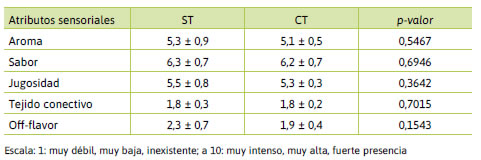 En la Tabla 4 se presentan los resultados del efecto de los taninos sobre las características sensoriales de la carne de vacas de refugo. Como se desprende de la misma, el análisis estadístico de los datos indicó que los taninos no afectaron de manera significativa los atributos evaluados, presentando la carne obtenida características de aroma, sabor y jugosidad aceptables, situándose los promedios para ambos tratamientos levemente por encima de la zona media de la escala. Estos resultados están en concordancia con lo expuesto anteriormente (Tabla 2) en relación con la falta de un efecto de estos compuestos secundarios sobre la concentración de la mayoría de los aminoácidos identificados vinculados con el sabor y el flavor. Por su parte, tanto la presencia de tejido conectivo como el off-flavor se percibieron muy levemente, con valores promedios próximos al extremo inferior de la escala, denotando una baja incidencia de los mismos. Estos últimos podrían estar relacionados con la falta de diferencias observadas en los valores de tbars por acción de los taninos, así como también por la baja concentración de mda. Coetzee y Hoffman (2001) señalan un elevado grado de correlación entre los valores de tbars y las evaluaciones sensoriales llevadas a cabo en carne oxidada y con sabores extraños. De acuerdo a la clasificación propuesta por estos autores, la carne madurada de ambos tratamientos de suplementación se corresponde con la de un producto de calidad tolerable, lo que se relaciona con las bajas valoraciones de los jueces para este atributo.