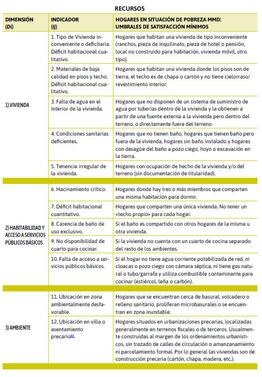 Aquí se propuso una serie de dimensiones e indicadores tentativos, con umbrales remitidos a derechos elementales a satisfacer para superar el estado de pobreza. Sin embargo estos satisfactores se pueden cambiar, excluir algunos, incluir otros, actualizar sus umbrales de satisfacción de acuerdo con las metas u objetivos de desarrollo sostenible que propone lograr el país en los próximos años, consensuando los indicadores en los que se quiere hacer énfasis desde el Estado para planificar políticas de desarrollo social.