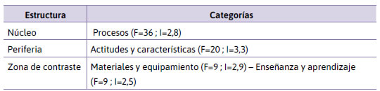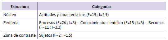 Se observa en esta tabla que el núcleo de la RS predominante contiene exclusivamente a la categoría «Actitudes y características». A su vez, la periferia es la zona que mayor diversidad de expresiones alberga, conteniendo las categorías «Procesos», «Conocimiento científico» y «Recursos». Por último, la zona de contraste se relaciona de forma única con la categoría «Sujetos».