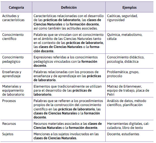En un paso posterior, y a los efectos de que fueran los mismos participantes quienes brindaran una jerarquización de sus opiniones, se solicitó que ordenaran las palabras mencionadas en orden decreciente de importancia. Además, con el fin de conocer la significación de cada una, se les pidió que fundamentaran las razones por las cuales las habían elegido, para de esta manera conocer las vinculaciones establecidas por los sujetos entre el término inductor y las expresiones mencionadas. Una vez concluido el proceso de recolección, se elaboraron categorías de análisis a posteriori, a fin de agrupar las palabras y expresiones (Mazzitelli y otros, 2009) para cada uno de los términos inductores. Para construir las categorías se consideró la significación otorgada por los sujetos a dichas expresiones y se realizó una triangulación entre investigadores, lo que contribuye a disminuir el sesgo subjetivo en el procesamiento de datos cualitativos (Denzin y Lincoln, 2018; Vasilachis de Gialdino, 2006). Al finalizar el proceso de construcción de categorías se detectó que para los tres términos inductores algunas categorías eran compartidas, mientras que otras eran exclusivas de un término inductor en particular. Por tal motivo, y para evitar reiteraciones, las categorías elaboradas se presentan a continuación, en la Tabla 1, destacando con negrita en la definición de las categorías los términos inductores asociados: