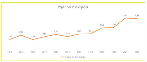 A nivel de la producción por investigador, también se constató una curva ascendente que pasó de 0,41 publicaciones/investigador en 2011 a 1,32 en 2022 (Figura 2).
