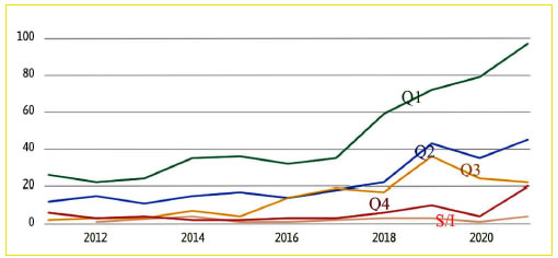 Con respecto al análisis de calidad de las publicaciones según la clasificación por cuartiles (Figura 3), se visualizó un aumento en las cuatro categorías. Las publicaciones correspondientes al cuartil 1 son las que experimentaron un mayor aumento. Las publicaciones sin indexar (S/I) permanecen en un número que disminuye en términos relativos ante el aumento del número total.