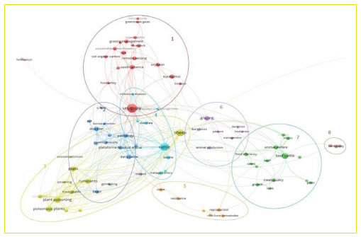 Complementariamente, al realizar un análisis más exhaustivo de las posibles temáticas abordadas, ahora a partir de los títulos y resúmenes de las publicaciones, se repiten de cierta forma los resultados de los análisis previos, con clusters vinculados a las publicaciones de producción y salud animal, producción vegetal y un agrupamiento menor en temáticas relacionadas al mejoramiento genético. Los conceptos vinculados a sostenibilidad ambiental no ocupan un lugar de destaque.