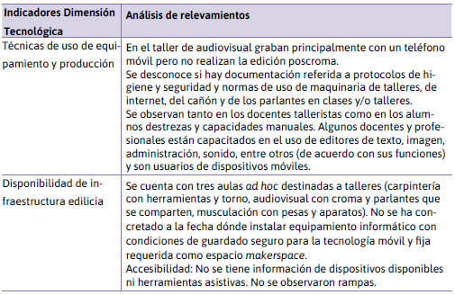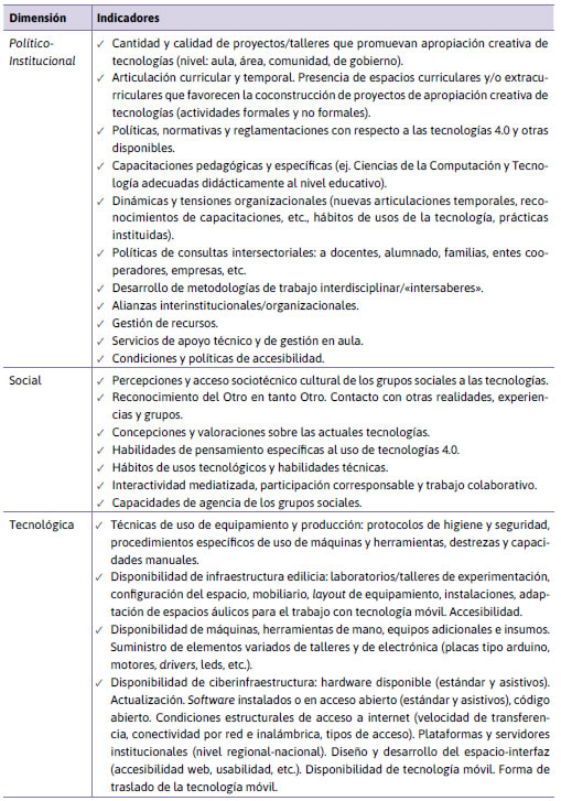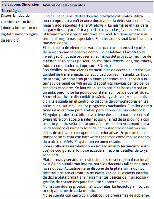 Dimensión Tecnológica: La dimensión tecnológica contempla la infraestructura técnica con la que cuentan los marcos socioinstitucionales estudiados. La disponibilidad y accesibilidad de artefactos y sistemas técnicos es una condición necesaria para el progresivo desarrollo de las competencias y habilidades tecnológicas (Tabla 3).