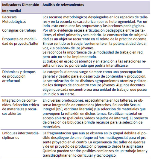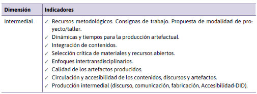 Dimensión Intermedial: Refiere al tipo de producción artefactual –material e inmaterial– y qué metodología solicita. Esta dimensión habilita distintos análisis más acordes a las múltiples posibilidades presentes en la actualidad, donde el paradigma informacional estructura y modela la materialidad técnica y simbólica. Desde esta mirada transversal, es posible vincular las prácticas propias de la presencialidad física con los soportes analógicos con las dinámicas y espacios de la virtualidad (sitios web, redes sociales y recursos disponibles en internet) y las tecnologías 4.0. En la Tabla 5 se exponen algunos de los indicadores que corresponden a este primer análisis.