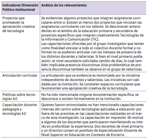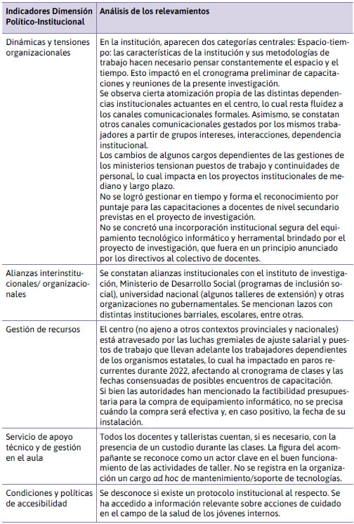 Dimensión Político-Institucional: se considera que la coconstrucción de redes sociotécnicas culturales se ve atravesada por lo político en cuanto disputa de poder por institucionalizar prácticas y discursos, reflejando las tensiones, los conflictos y los acuerdos entre los distintos actores sociales por formalizar y hacer explícitos diversos modos de funcionamiento y criterios orientados de acción. El análisis de los relevamientos se muestra en la siguiente tabla.