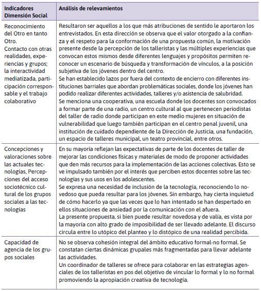 Dimensión social: El modo en que las personas interiorizan los objetos técnicos en su praxis vital está condicionado por la configuración sociocultural de la que forma parte y la generación de prácticas integrando tecnologías implica una actividad creativa y creadora vinculada a las herramientas e infraestructura disponible. El abordaje de esta dimensión posibilita conocer la dinámica de organización social, así como reconstruir de los sentidos compartidos alrededor de las experiencias y sus significaciones individuales y colectivas constituyen uno de los aspectos que conforman los «ambientes de interacción socio-técnico culturales» (Andrés et al., 2023). La Tabla 4 muestra lo relevado.