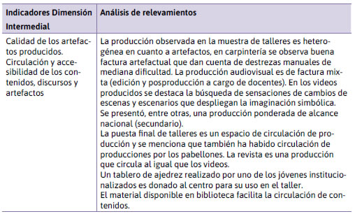 Lo relevado da cuenta principalmente de cómo el cuerpo directivo y el colectivo docente formal y no formal (talleristas) llevaban adelante sus tareas e interacciones, además de los aspectos relevantes de la organización y la infraestructura educativa. En el ordenamiento de toda la información, algunos de los indicadores solicitan una ampliación de documentación y/o informantes que no impacta significativamente en estos resultados, ya que esta información se podría obtener ya iniciado un proceso de coconstrucción de nuevas prácticas integradas. Por resguardo ético no se nombra el centro penal, ni se transcriben frases textuales, ni los nombres de quienes fueran entrevistados. Los permisos para realizar el trabajo en el centro otorgados institucionalmente al grupo investigador por un acuerdo de colaboración no autorizaban en los dos años entrevistas ni capacitaciones con la participación de los jóvenes internos.
