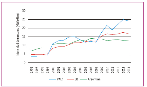 Figura 10. Variación en la intensidad de consumo eléctrico en el sector residencial en valc, lr y Argentina. Período 1996-2014