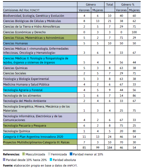 Entre las diversas expresiones de la situación de género en el sistema científico-tecnológico argentino, el análisis del universo de temas se encuentra atravesado por conceptos marco como: «disciplinas masculinizadas» vis à vis «disciplinas feminizadas». Asimismo, se estima como situaciones de «equidad/ paridad de género» hasta un porcentaje estándar entre el 60 % y el 40 % vis à vis «discriminación/no paridad», cualquier rango fuera del estándar (Estébanez, 2010). Continuando con este parámetro, pero agregándole una situación de paridad en porcentaje desde el 10 % hasta el 20 %, se analizará a continuación la composición de las comisiones de evaluación del foncyt.