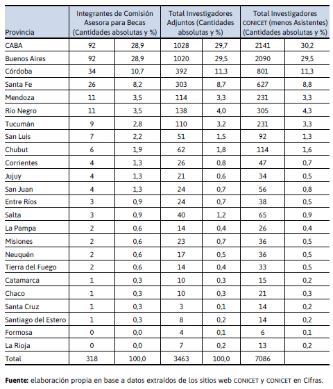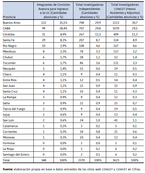 Luego de la descripción hecha en el párrafo anterior, se afirma que la distribución de miembros en las Comisiones Asesoras para Informes, Promociones y Proyectos de conicet según la provincia de lugar de trabajo se corresponde con la cantidad de investigadores de conicet en dichas provincias que reúnen los requisitos para ser elegidos integrantes de las mismas. Concretamente, el porcentaje que representa cada provincia en el total de miembros de la comisión se traslada con una diferencia aproximada de un +/- 2 % del total de investigadores Independientes o totales –excepto Asistentes y Adjuntos– que trabajan en cada provincia. La excepción es caba, ya que si bien representa un 29,8 % de investigadores Independientes y un 29,5 % de investigadores de conicet –salvo Asistentes y Adjuntos– posee un 22,8 % de miembros en las Comisiones Asesoras para Informes, Promociones y Proyectos, es decir, se encuentra sub-representada.