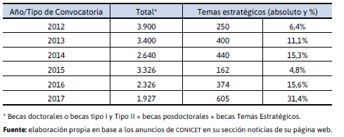 A partir de 2012 se profundizó la orientación de la investigación mediante la política de formación de recursos humanos, cuando se introdujo la categoría de Temas Estratégicos en las convocatorias a becas de posgrado y de posdoctorado. Al igual que en el caso de la anpcyt, los temas son los identificados en el Plan Nacional de Ciencia, Tecnología e Innovación Productiva 2012-2015 y, posteriormente, aquellos señalados en el Plan Argentina Innovadora 2020. Acompañando cada convocatoria se adjuntaba el listado de los temas en cada uno de los seis sectores identificados: Agroindustria, Ambiente y Desarrollo Sustentable, Desarrollo Social, Energía, Industria y Salud. En el caso de las becas para Temas Estratégicos no hubo conformación de comisiones especiales, sino que las mismas comisiones disciplinares se encargaron de su evaluación contemplando los criterios de las bases de la convocatoria.