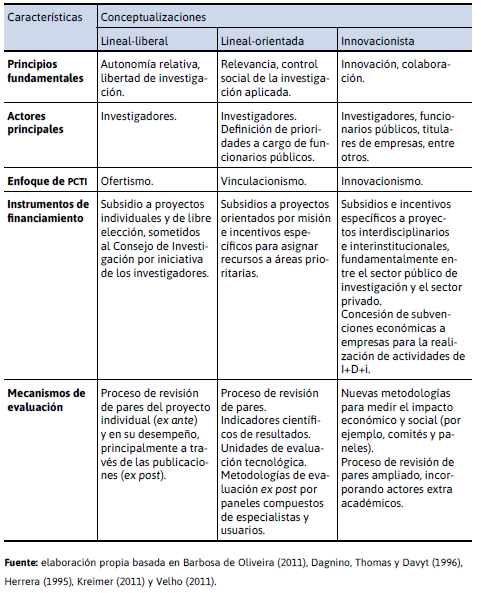 A partir del estudio del proceso de internacionalización de las políticas científicas, tecnológicas y de innovación (pcti), el cual consiste en que diferentes países adoptan los mismos enfoques, instrumentos y formas similares de gestión, Velho (2011) afirma que la evolución histórica de las «políticas explícitas» (Herrera, 1995), implementadas por los países para estimular la producción y el uso del conocimiento científico y tecnológico, está fuertemente correlacionada con la evolución del concepto dominante de ciencia. Dicho con otras palabras, la autora sostiene que el enfoque, los instrumentos y las formas de gestión que definen la pcti en un determinado momento están estrechamente relacionados con la conceptualización preponderante acerca de la ciencia (Velho, 2011).