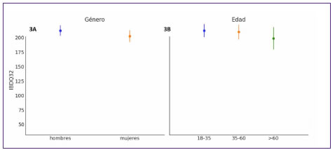 La calidad de vida desde el punto de vista de la salud intestinal se midió mediante la escala generada por el ibdq32, la cual es una variable discreta que se distribuye en el rango de 32 a 224 (en nuestra muestra, entre 80 y 224). Evaluamos el ajuste de la muestra ibdq32 a tres distribuciones: negativa binomial, normal y normal truncada (límite superior 224). Los valores del ibdq32 tiene una media de 193,1 (y un valor máximo de 224) y una desviación estándar de 24,2 (Figura 1B). Usamos waic (Watanabe, 2013) a fin de evaluar el ajuste. Encontramos que la distribución con un valor de waic inferior (y por lo tanto el mejor modelo, entre las alternativas evaluadas) es una normal truncada (Figura 2). La dimensión gastrointestinal tuvo una media de 61,3±5,2 puntos (de un máximo posible de 70), la sistémica tuvo una media de 24,8±8,8 (de un máximo posible de 35), el emocional fue el más variable, con una media de 67,4±13,3 (de un máximo posible de 84), y el dominio menos variable fue el social, cuya media fue de 32,6±3.6 (de un máximo posible de 35). Los valores de ibdq32 no mostraron diferencias relevantes respecto al género (Figura 3A). Además, no se observaron diferencias relevantes en el puntaje total del ibdq32 con respecto a la edad (Figura 3B), aunque los hombres presentaron valores más altos en la dimensión emocional (datos no mostrados).