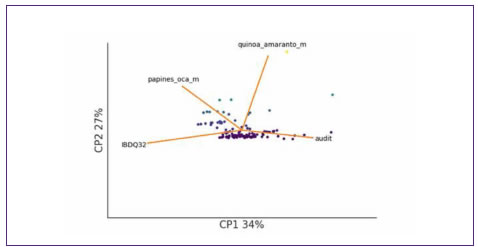 Con el fin de investigar las relaciones existentes entre el patrón de consumo, la calidad de vida desde el punto de vista de la salud intestinal y la frecuencia de consumo de alimentos que contengan cultivos andinos, se realizó un análisis de componentes principales (Figura 5). Para este análisis se utilizó la implementación de pca de Scikit-learn, que es un pca probabilístico tal cual se describe en Probabilistic principal component analysis. (Tipping y Bishop, 1999) se utilizaron los parámetros por defecto y los datos fueron estandarizados antes de hacer el pca. Se observa que el consumo de alcohol y la calidad de vida desde el punto de vista de la salud intestinal poseen una correlación negativa, es decir, patrones de alto consumo de alcohol tienden a asociarse con valores bajos de ibdq32, y viceversa. Por otra parte, la calidad de vida se asocia positivamente con el consumo de papas andinas, mientras que el consumo de quínoa no muestra una tendencia clara de asociación con las otras variables.
