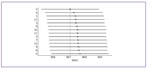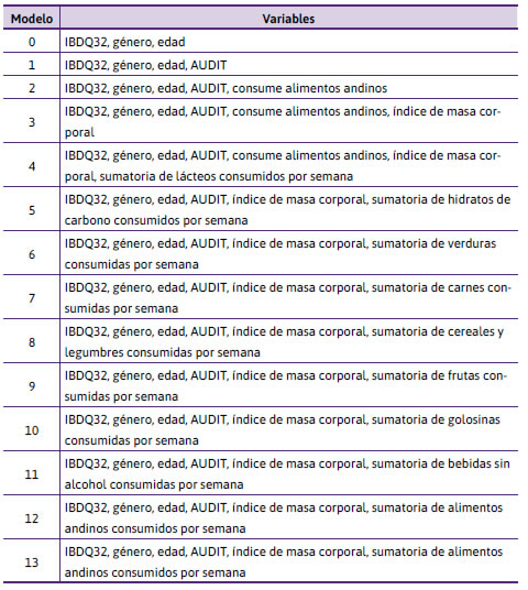 Finalmente, se realizaron varias regresiones lineales, todas ellas con ibdq32 como variable respuesta (y asumiendo una distribución normal truncada para esta variable). Las diferentes combinaciones de variables predictoras se detallan en la Tabla 1. Se usó waic como criterio para comparar los distintos modelos. El modelo que mejor ajusta nuestra muestra es el que tiene como variables predictoras a los índices de audit, la edad, el sexo, el índice de masa corporal y si consume alimentos andinos (quínoa, amaranto y papa andina) (Figura 7 y Tabla 1). Las diferencias entre valores de waic son muy pequeñas, indicando que todos los modelos evaluados tienen similar capacidad predictora.