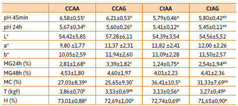 Por otro lado, se encuentran diferencias significativas (p < 0,05) entre los valores medios de humedad (h) para los diferentes genotipos observados. ccaa presenta las mayores mediciones para humedad en carne fresca que se corresponden con el elevado pH observado a los 45 minutos post mortem. Todos los genotipos resultaron en valores similares para los parámetros de color L*, a* y b* por lo que este SNP no estaría relacionado a este atributo.