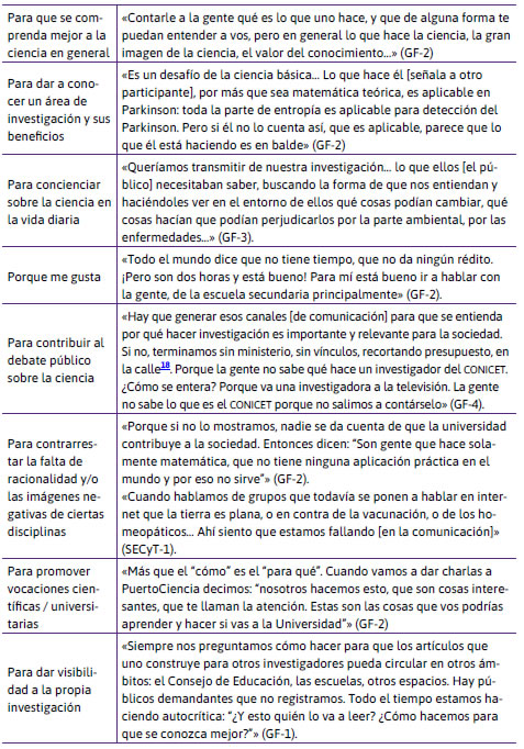 En su estudio sobre las percepciones y actitudes de los investigadores del conicet respecto de la comunicación científica, Kreimer, Levin y Jensen (op. cit.) identificaron una serie de factores esgrimidos por sus encuestados para justificar su involucramiento. El primero en la lista fue el factor aludido en términos de «responsabilidad» u «obligación», reconocida como un mandato institucional o de índole subjetiva. A continuación se reproducen otras razones que aparecen entre los investigadores de la uner, incluyéndose una referencia típica de los testimonios que la reflejan: