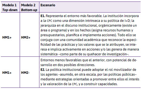 Dado que no existen instituciones sin agentes, y los agentes solo son tales en el contexto de ciertas instituciones, ambos modelos claramente se articulan entre sí. De la convergencia entre los condicionantes macro y micro emergen cuatro escenarios (E) posibles para el desarrollo, proyección y sostenibilidad de las prácticas de asct/cpc en el ámbito de los organismos científico-tecnológicos. Sin que ello implique plantear una relación de causalidad unilineal, y teniendo en cuenta que los valores positivos y negativos de las categorías no se presentan de modo absoluto sino en gradientes, dichos escenarios pueden sintetizarse como sigue: