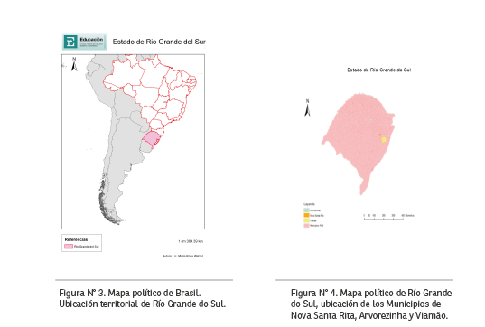 3. Los mapas políticos de la República Argentina y de la República Federativa do Brasil son fuentes propias, elaboradas con la colaboración de diferentes investigadores del Área de Geografía e Ingeniería Agronómica; estos elementos cartográficos fueron construidos en agosto de 2014, en el Departamento de Sensoramiento Remoto, de UFRGS en la Ciudad de Porto Alegre, bajo la Dirección y Coordinación del Dr. Laurindo Guaselli. La figura N° 4 corresponde a septiembre de 2015, la misma muestra los municipios a los cuáles pertenecen las escuelas visitadas.
